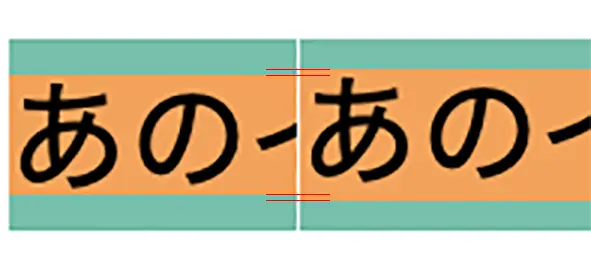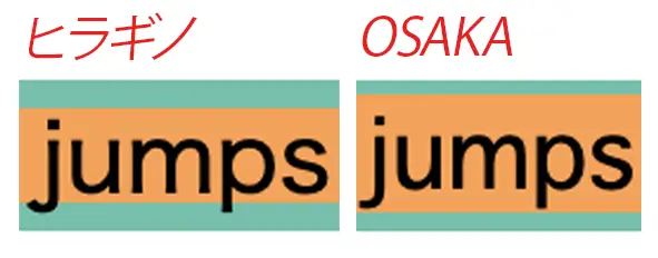 ヒラギノ角ゴシックとOsakaの表示をよく見てみると、ディセンダー部分(j,p,gなどの、下にはみ出している部分)に違いが見られます。ヒラギノはディセンダーがspanの背景色を突き抜けていますが、Osakaはディセンダーもspanの背景色の中に入っています。