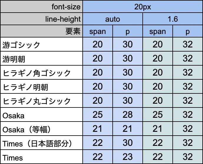 最終的に同じフォントファミリーが適用されているにもかかわらず、Timesを指定した場合と、ヒラギノ角ゴシックを指定した場合で、spanの高さが2px異なるという結果になりました。