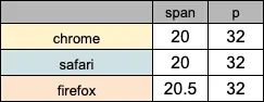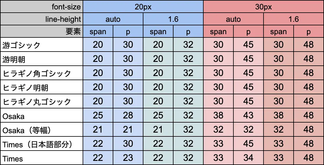 上記の通り、フォントファミリーのOsakaとTimesでは、spanとpの高さが他と異なる値になりました。