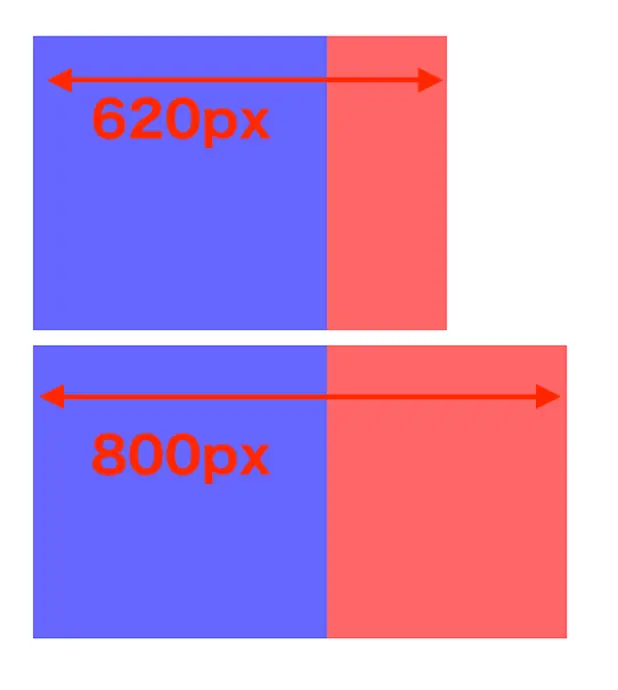 2つを合わせた全体の幅は620pxとしました。大きな画像が入る領域(青い部分)は440pxとし、サムネイルの領域(赤い部分)は自動的にに決まる(この場合は180pxになる)、というようなコードを書いていきます。