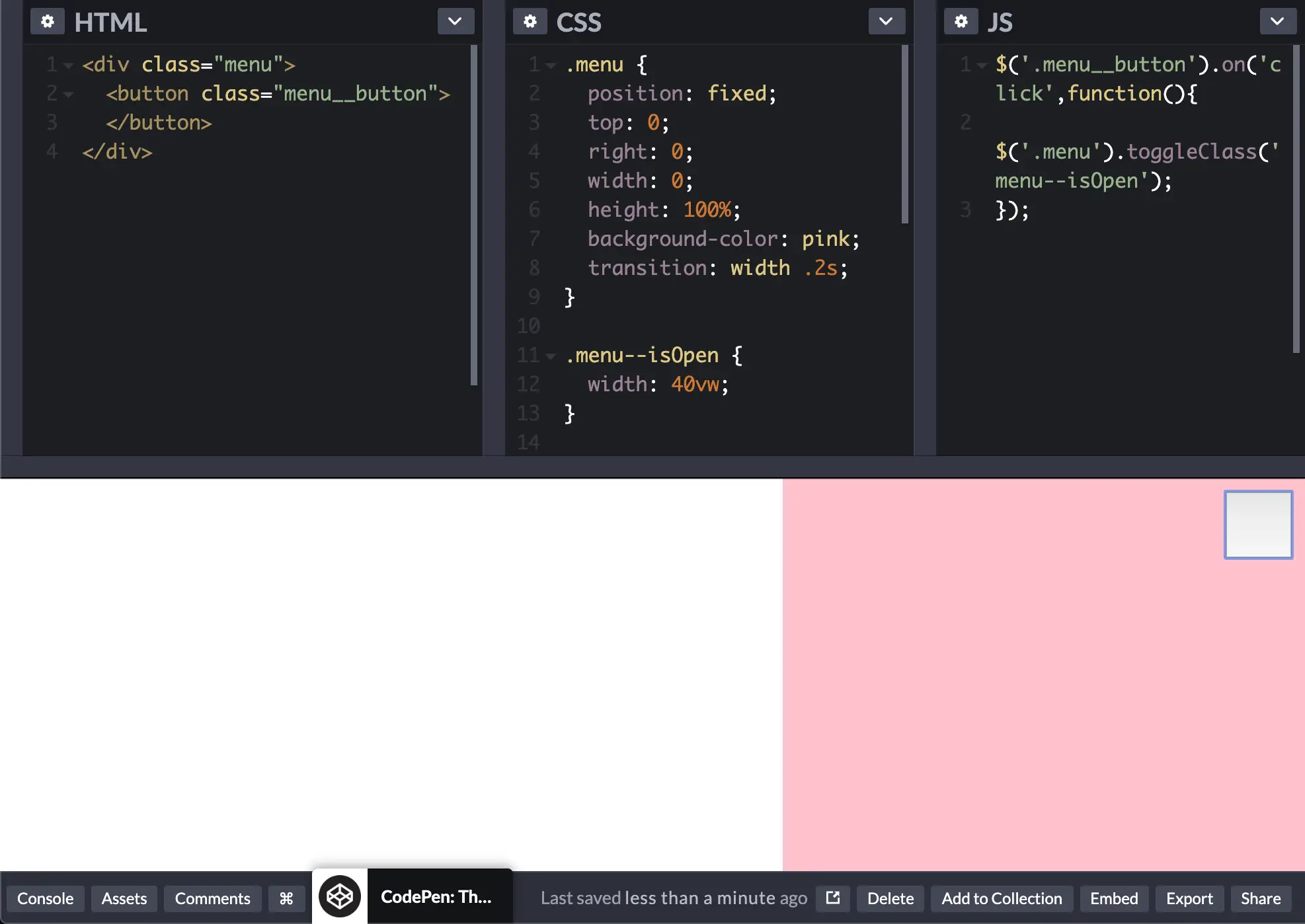 .menuの要素ははじめwidthを0にしておき、.menu--isOpenがついたときだけwidthが40vw;(ブラウザ幅の40%)にします。