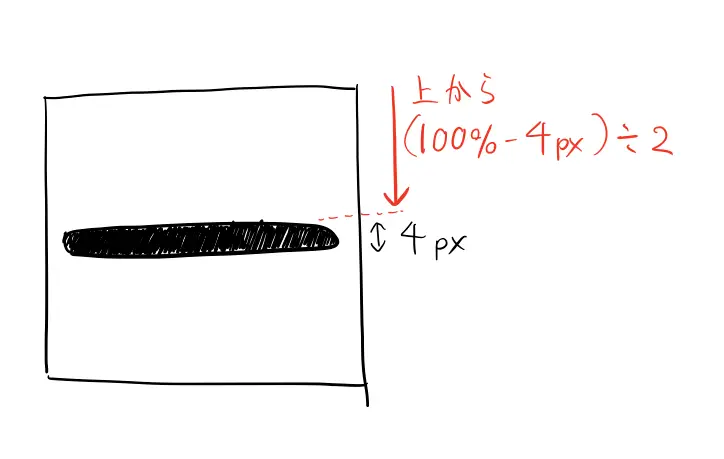 topプロパティだけcalcを使って少し複雑な値を指定しています。これは、ボタンの高さ100%から、線1本分の幅4pxを引いて、その半分の値を上からとるという指定です。こうすることで、縦位置中央に線が配置されます。