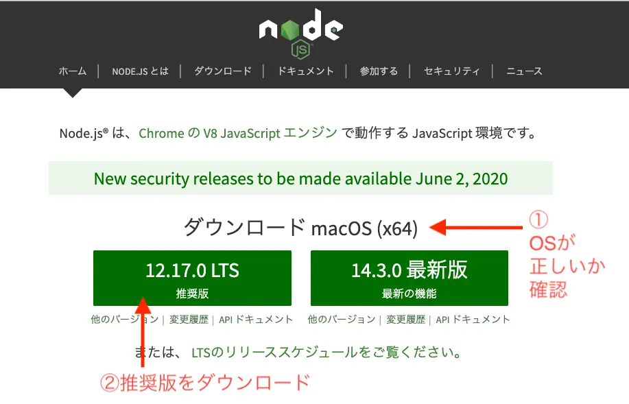 Node.js公式サイトからインストーラーをダウンロードします。