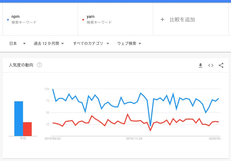 Googleトレンドの検索結果をみると、yarnよりnpmの方が検索されていることがわかります。(記事投稿時点の日本の数値です)