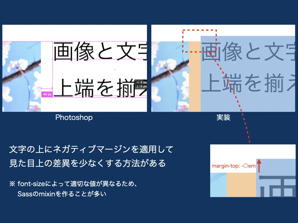 先述の例では、font-size: 72pxの文字に対して、margin-top: -20pxを設定することで、だいたいPhotoshopと同じ見た目になったかと思います。