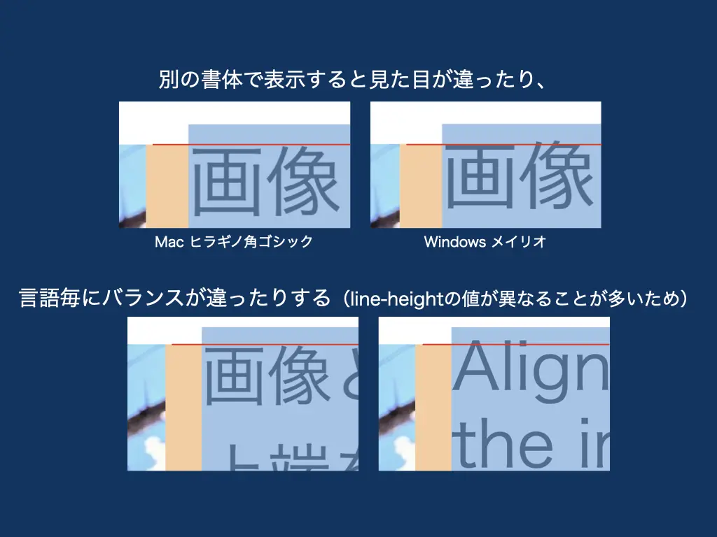 - ウェブフォントを使わずデバイスフォントを使用している場合は、当たっている書体ごとに適切な上余白が異なる