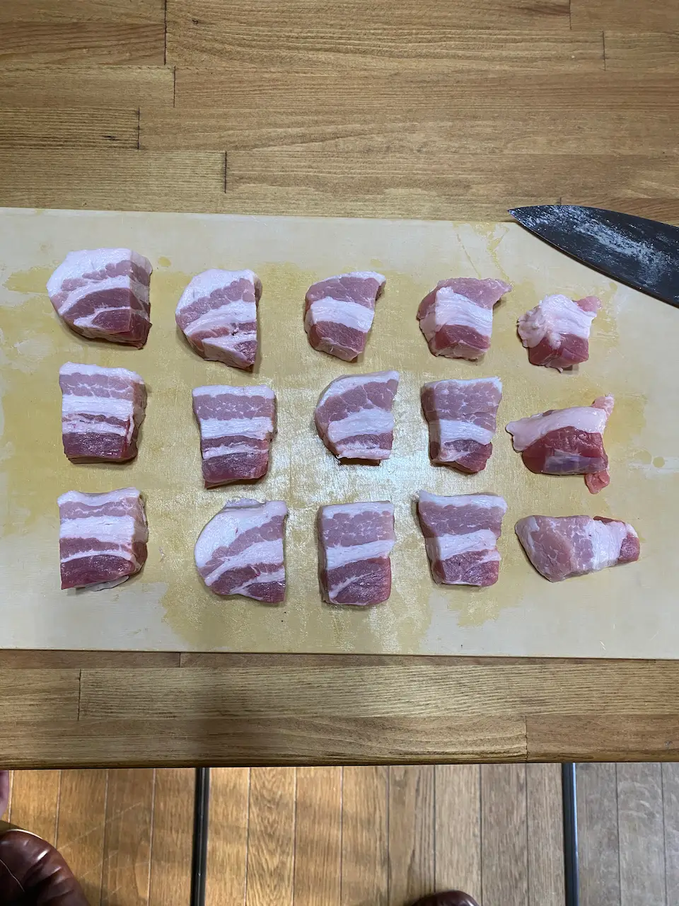 豚バラブロックを、2cm角ぐらいの角切りにします。