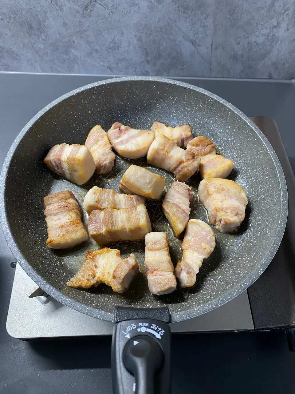 その後、フライパンを強火で熱し、豚バラ肉の表面をこんがり焼き目がつくまで焼いていきます。