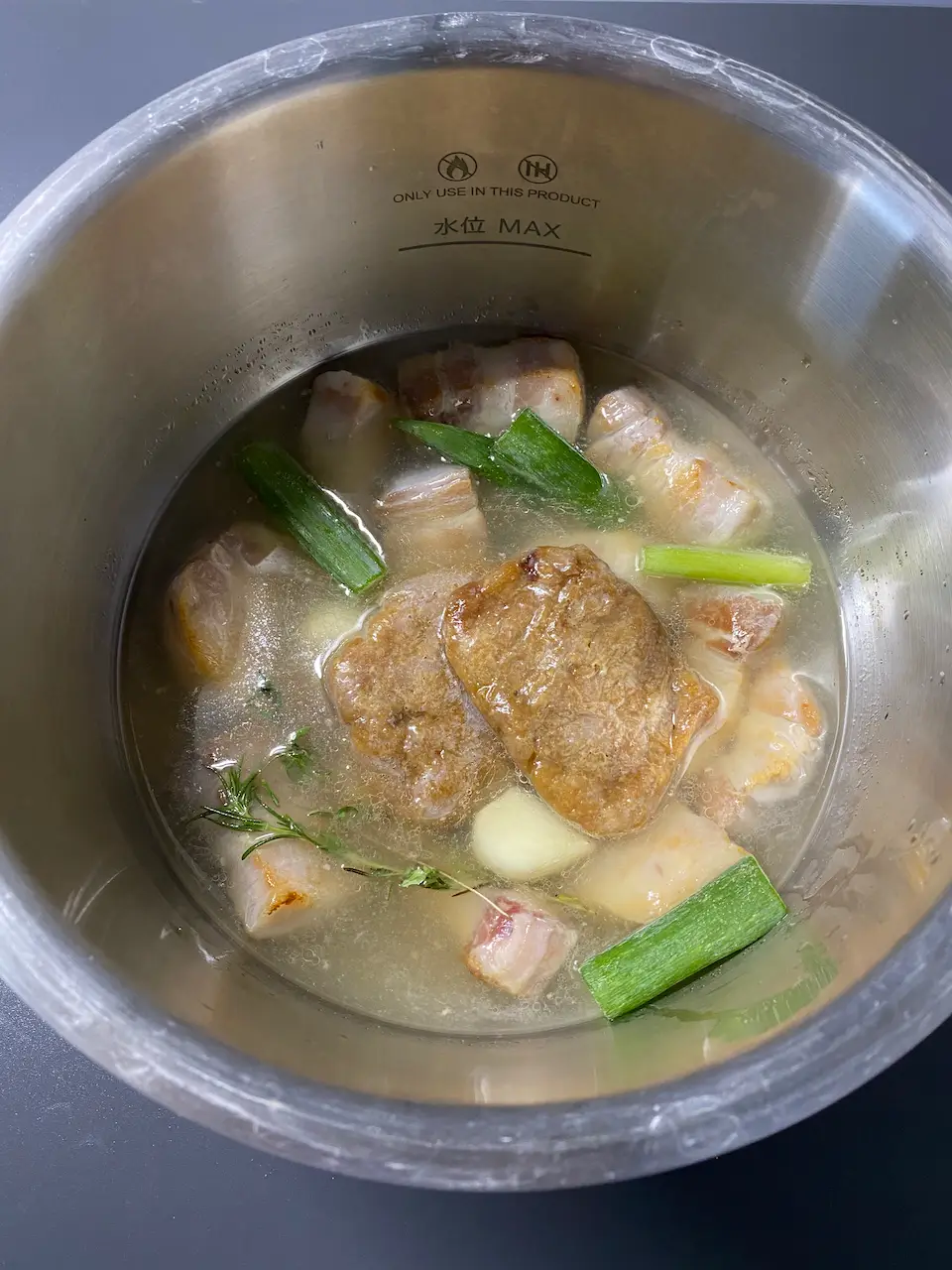 2時間煮込んだ後、ネギと香草を取り出し、そこからさらに2時間煮込みます。